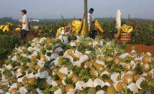 據(jù)悉,2013年以來,該場組織職工因地制宜,大力發(fā)展菠蘿種植業(yè),目前已經(jīng)有1528畝陸續(xù)收獲,預(yù)計今年可收獲菠蘿3156噸,其產(chǎn)品遠銷吉林、河南等地。圖為該場職工群眾采摘菠蘿供應(yīng)市場。
