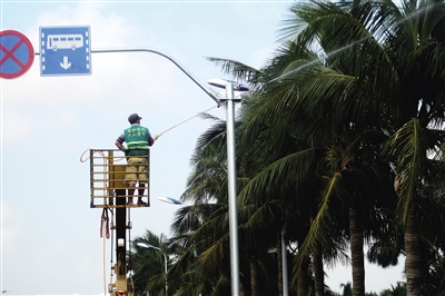 10月20日,在海口市濱海大道,環(huán)衛(wèi)工人為椰子樹噴灑藥物,給椰子樹除蟲保健。據(jù)工作人員介紹,今年受天氣的影響,特別是受幾次大臺(tái)風(fēng)的肆虐后,很多椰子樹都遭受不同程度的病蟲害,嚴(yán)重影響著椰子樹的健康成長。本報(bào)記者 陳元才 攝