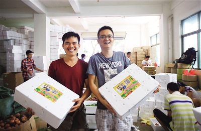11月12日,在位于??谀媳彼袌?chǎng)的倉(cāng)庫(kù)里,創(chuàng)業(yè)青年林志遠(yuǎn)與他的合作伙伴正在忙著將各類(lèi)水果打包,運(yùn)給全國(guó)各地的網(wǎng)購(gòu)客戶。 本報(bào)記者 張杰 攝