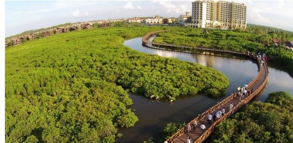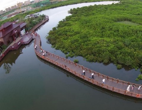 2014年8月23日,海南紅樹林濕地保護公園正式開放,吸引眾多游客利用周末時間前來。圖為游客在木棧道上觀光游覽。據(jù)介紹,海南紅樹林濕地保護公園位于澄邁境內(nèi),園內(nèi)有4.2公里原木木棧道、紅樹灣濕地體驗館(博物館)、火烈鳥風情餐廳等7大精彩配套設(shè)施,其中省內(nèi)唯一建設(shè)在紅樹林區(qū)域中的親子游樂園、省內(nèi)首只最大畫舫、來自古巴的上百只火烈鳥等,又成為游客有一個好去處。