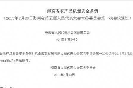 海南省第五屆人民代表大會常務(wù)委員會第一次會議于2013年3月30日通過了《海南省農(nóng)產(chǎn)品質(zhì)量安全條例》,并且于6月1日起正式實施……