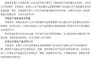 海南出臺農(nóng)產(chǎn)品質(zhì)量安全條例建立農(nóng)產(chǎn)品質(zhì)量安全舉報獎勵制度
